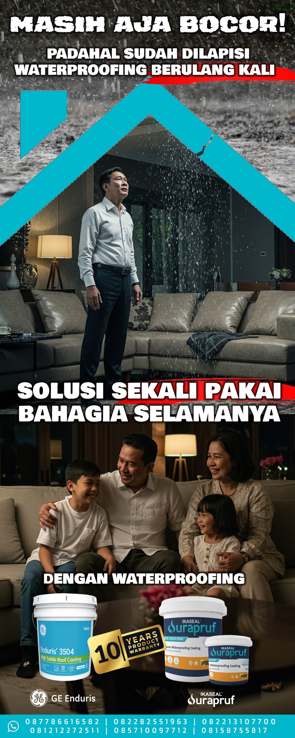 GE Enduris dan IKASEAL® Durapruf, cat waterproofing pelapis anti bocor kualitas tinggi, tahan sinar UV matahari,  tidak larut air dan minyak, praktis 1 komponen aplikasi 1 lapis, menjaga nilai investasi bangunan anda.
